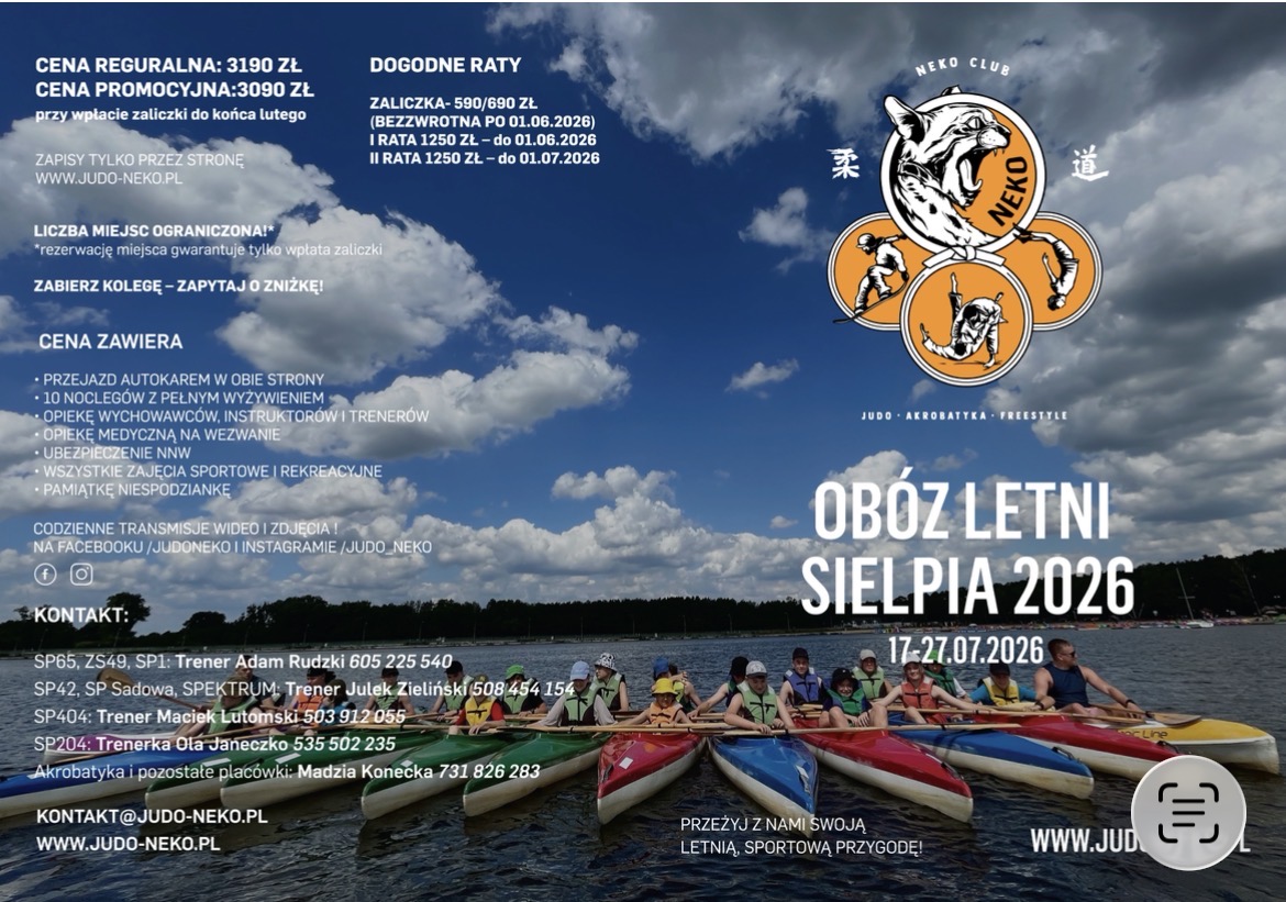 Jest to nasz główny obóz letni, który robimy już od wielu lat! Sielpia znajduje się niedaleko Kielc, a nasz ośrodek otacza las i mamy prawie bezpośredni dostęp do jeziorka. Ośrodek jest tylko dla nas więc w czasie wolnym dzieci mają dostęp do boiska, placów zabaw, trampolin itd. Na tym obozie głównie skupiamy się na szeroko pojętej rekreacji ruchowej, czyli duuużej dawcę różnorakiego sportu. Nie ma z nami czasu na nudę od rana działamy, jak nie plaża i pluskanie, to rowerki wodne lub kajaki, park linowy, przeprawy przez rzeczkę, budowanie szałasów w lesie, paintball, łuki, akrobatyka, judo, randori z innymi klubami (na sali wyłożonej profesjonalną matą i wyposażoną w air track oraz batut), walka na balony z wodą, zbijak, plastyka, gry planszowe, gokarty, trampoliny i wiele wiele innych! Na obozie czeka nas również dyskoteka przebieraniec, wspólne ognisko, uczta kinomaniaka z popcornem na macie, wycieczki na lody no i oczywiście pamiątki.